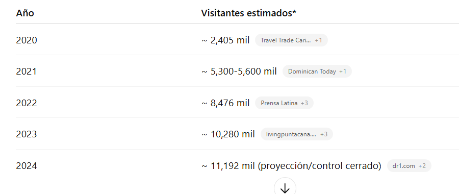 - En 2024: 11,192,047 visitantes en total: 8,535,742 por vía aérea + 2,656,305 por cruceros. (Fuente: Presidencia de la República) Mitur