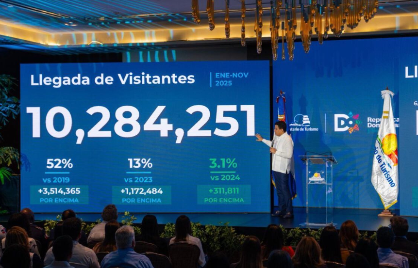 David Collado informó que, hasta el 30 de noviembre, la República Dominicana ha recibido 10,284,251 visitantes, una cifra que representa un cierre récord cuando finalice el año 2025, según anunció el ministro de Turismo.
