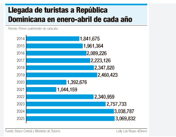 El funcionario indicó que, en esos once meses, el país recibió 7,884,421 turistas por vía aérea, lo que representó un crecimiento de un 35 % respecto a 2019, un 10 % con relación a 2023 y un 3 % en comparación con 2024.