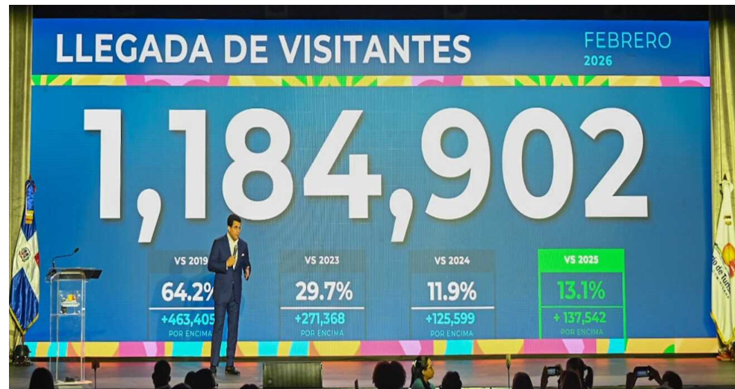 Dijo que la llegada de 1,184,902 en febrero, representa un crecimiento de un 13.1% con relación al mismo mes del 2025, un 11.9% respecto al 2024 y un 64.2 frente al 2019.